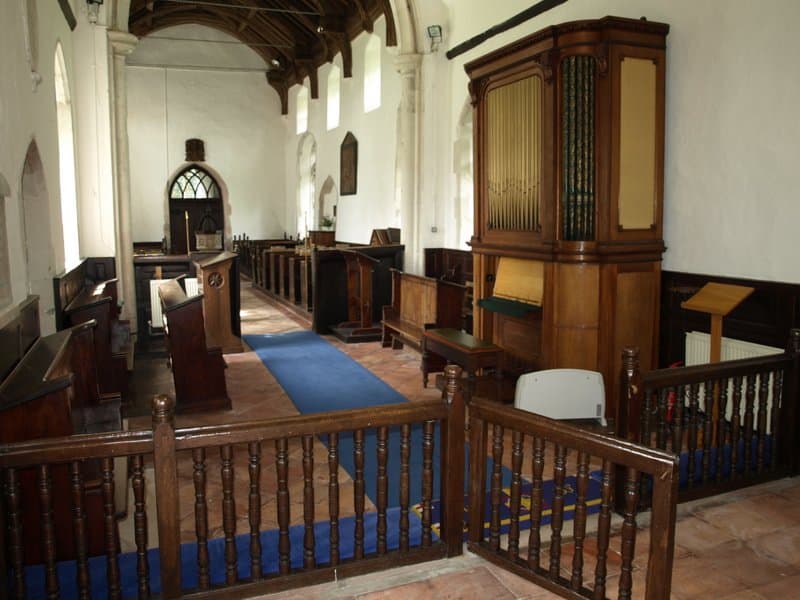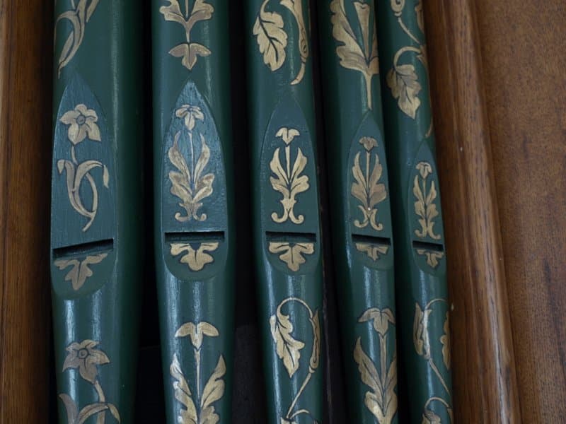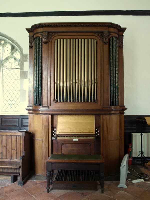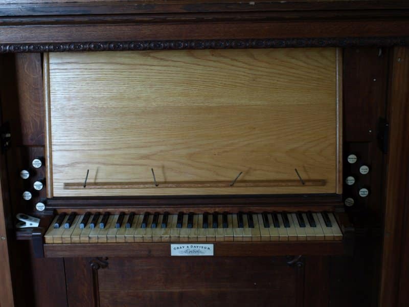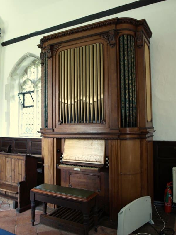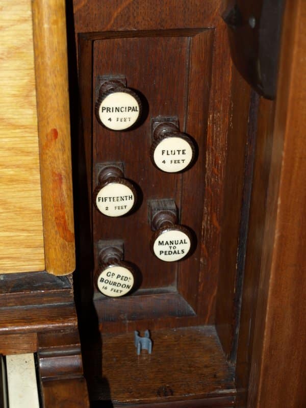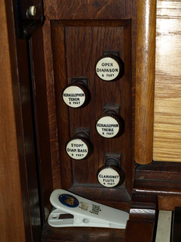 MANUAL (C – g3) 56 TOETSEN: Open Diapason 8′ (TC), Stopped Diapason Bass 8′ (C-H), Clarionet Flute 8′ (TC), Keraulophon 8′ (C-H), Keraulophon 8′ (TC), Principal 4′, Flute 4′, Fifteenth 2′.