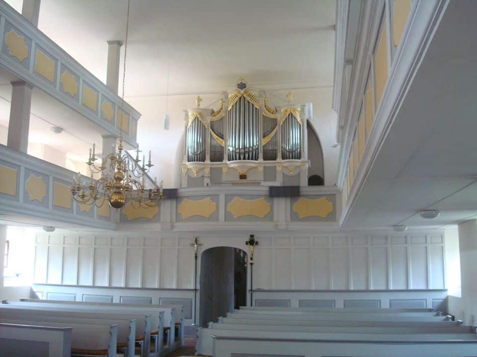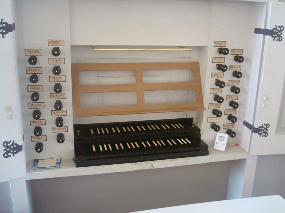 Oberwerk: CD – c3 Gedackt 8′, Rohrfloet 4′, Nassat 3′, Octava 2′, Tertia 1 3/5′, Quinta 1 1/3′, Flaschalet 1′, Mixtur 3 fach (1′).