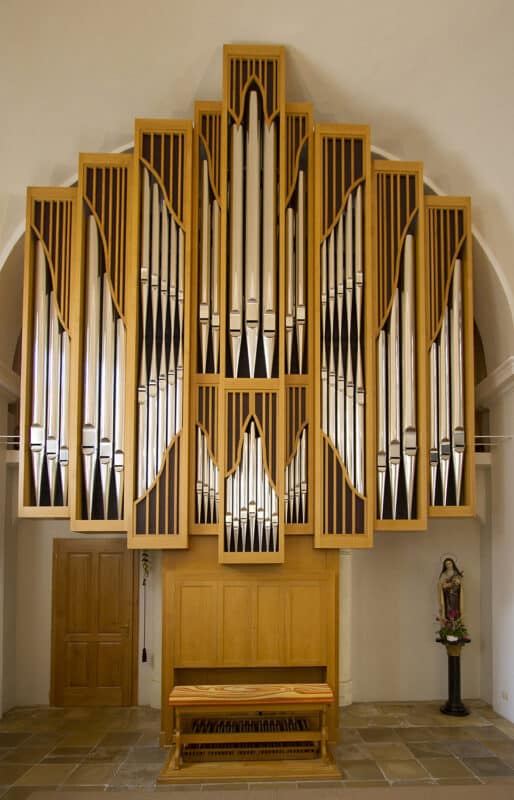 RÉCIT EXPRESSIF (C – g3) 56 TOETSEN: Cor de Nuit 8′, Viole de Gambe 8′, Voix Céleste 8′ (from c°), Prestant 4′, Flûte Octaviante 4′, Nasard 2 2/3′, Quarte de Nasard 2′, Tierce 1 3/5′, Hautbois 8′, Clarinette 8′.