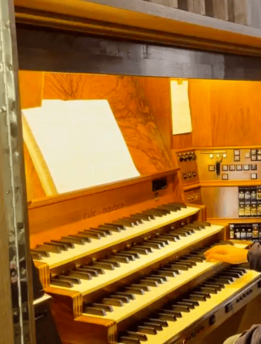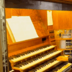 SCHWELLWERK (C – g3) 56 TOETSEN: Spitzprinzipal 8′, Koppelflöte 8′, Unda Maris 8′, Holzprinzipal 4′, Quintatön 4′, Spitzoktave 2′, Singend Nachthorn 2′, Rohr-Gemsquinte überblasend 1 1/3′, Oktave 1/2′, Sesquialter 2 fach, Un-Tredezime 2 fach, Windharfe 2-3 fach, Prinzipal Mixtur 3-5 fach, Dulzian 16′, Rohrkrummhorn 8′, Hautbois 4′, Tremulant.