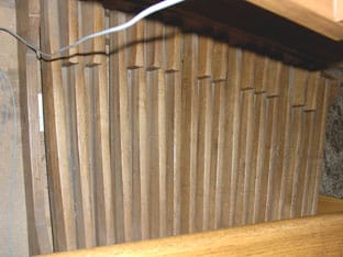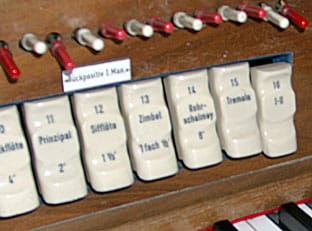 Rückpositiv: (C-g3) Holzgedackt 8 Salicional 8 Blockflöte 4 Prinzipal 2 Sifflöte 1 1/3 Zimbel 3f 1/2 Rohrschalmey 8 Tremolo |